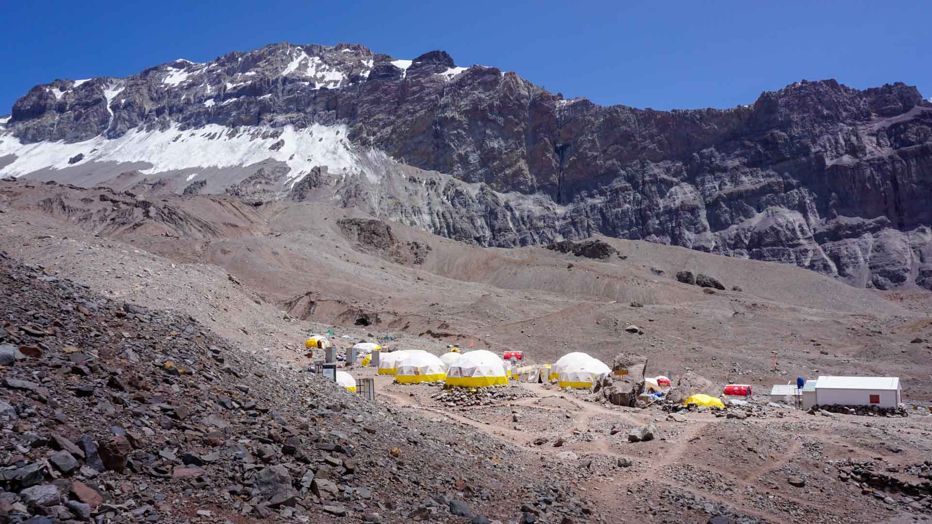 Bis zum Lager II steigen wir zunächst in 3 - 4 Stunden einmal mit dem Nötigsten auf. Die persönliche Ausrüstung ist wieder selbst zu transportieren, unterstützt werden wir aber auch hier wieder von unseren Trägern. Der Weg führt uns zunächst steil zum Ameghino Sattel zwischen Cerro Ameghino und Aconcagua hinauf. Anschließend queren wir unterhalb des Polengletschers auf einem Aussichtsbalkon zur Guanacos Traverse. Das Lager II wurde bereits größtenteils im Vorfeld errichtet, so dass wir wieder nur unsere Schlafzelte aufstellen müssen. Die Wasserversorgung erfolgt hier ebenfalls über einen kleinen Wasserlauf. Vom Lager II können wir bereits die nächste Etappe zum Lager III einsehen, welches nur 500 m höher liegt. Nach dem Mittagessen steigen wir wieder zum Lager I ab und übernachten dort, um uns weiter zu akklimatisieren.