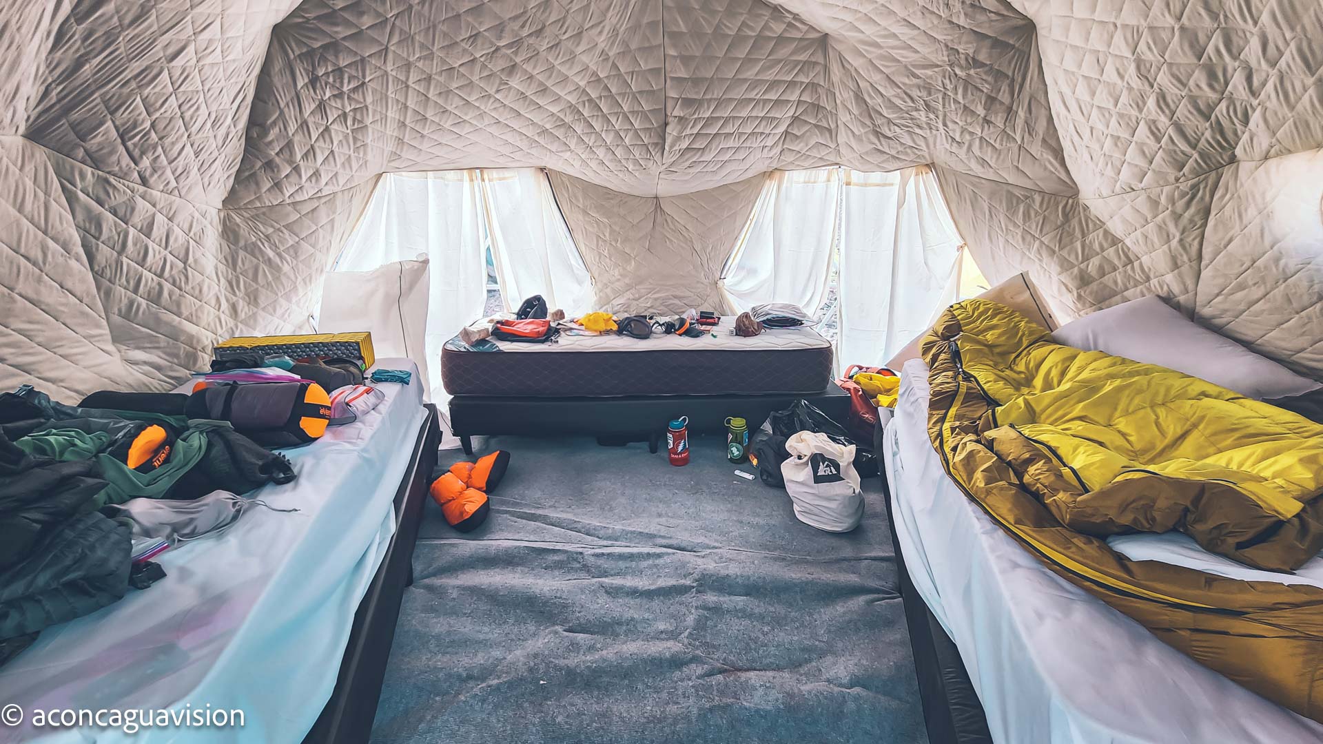 Wir brechen unsere Zelte in Camp II ab und nutzen den ganzen Tag, um bis zum Lager III auf ca. 6.000 m Höhe aufzusteigen. Über einen sanften Weg gelangen wir mit einer letzten steilen Etappe zu den "Piedras Blancas". Auch hier hat unsere Mannschaft das Camp bereits vorher an einer möglichst windgeschützten Stelle errichtet. Je nach Verhältnissen kann bereits Schnee liegen. Ein zusätzlicher Träger fungiert hier als Unterstützung in Notfällen. Im Camp angelangt und eingerichtet, erfolgt ein letzter Ausrüstungs-Check und schließlich die Planung des Gipfeltages. Sollte dem nichts entgegen stehen, geht heute auch die persönliche Ausrüstung, welche wir im Basislager zurück gelassen haben, auf den Weg zum Plaza de Mulas.
