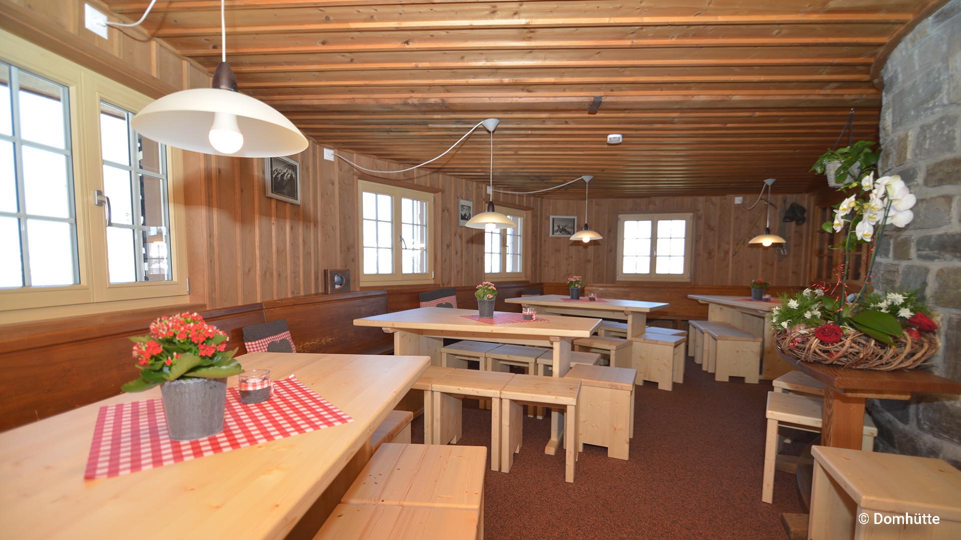 Wir nutzen die Domhütte für unsere Touren Die großen Grate im Wallis und Die großen 4.000er im Wallis. Durch ihre Lage zieht die Hütte hauptsächlich Hochtourengeher an was dem langen und anspruchsvollen Zustieg geschuldet ist. Von hier machen die meisten ganz klassisch den Dom, aber es gibt auch weitere Möglichkeiten sich im alpinen Gelände auszutoben. Klassiker wie das Täschhorn und die Lenzspitze sind hier zu nennen. Die Hütte wurde nach dem sie 1890 eingeweiht wurde vielfach umgebaut und modernisiert. Die heutige Form soll der eines Bergkristalls entsprechen. Die Hütte ist sehr modern und gemütlich eingerichtet. Die Verpflegung ist hervorragend und bei den hausgemachten Röstispezialitäten und einem kühlen Bier kann man auf der Sonnenterrasse mit Aussicht auf die umliegenden 4000er perfekt entspannen. In der Ferne sind die mächtigen 4000er Zinalrothorn, Weissmieß und Obergabelhorn sichtbar. Insgesamt ein perfekter Stützpunkt für Touren um den Dom.