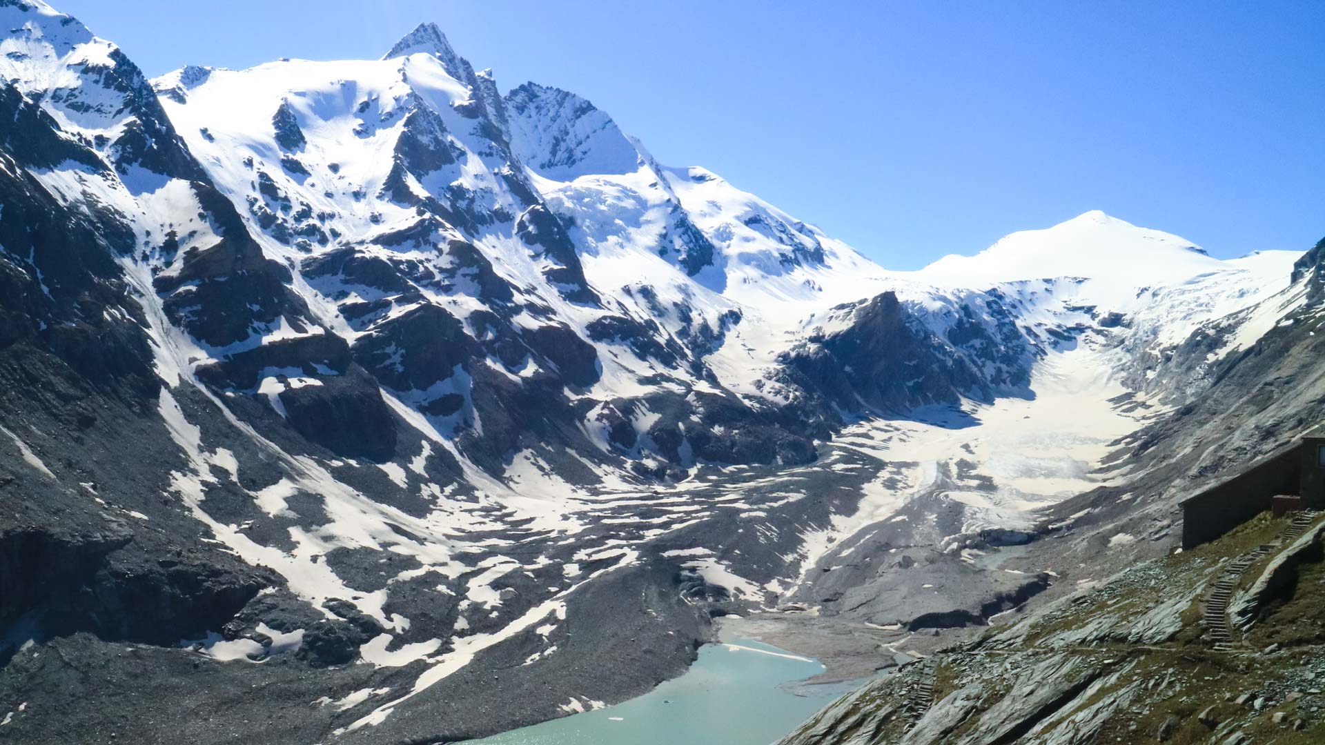 Unser Treffpunkt ist die große Aussichtsplattform der berühmten Kaiser-Franz-Josefs-Höhe. Noch bevor unsere Hochtour beginnt, hast Du schon überwältigende Eindrücke auf dieser geschichtsträchtigen und berühmten Hochalpenstraße gewonnen. Die Aussicht von der Kaiser-Franz-Josefs-Höhe eignet sich prima, um den Tourverlauf zu erklären. Anschließend folgen wir dem Gamsgrubenweg durch die botanisch sehenswerte Gamsgrube entlang der abschmelzenden Zunge der Pasterze in den Wasserfallwinkel. Von hier steigen wir hinauf zur Oberwalder Hütte, die grandios auf dem Großen Burgstall in knapp dreitausend Metern Höhe liegt. Schon von hier aus ist der Blick in die wilde Nordflanke des Großglockners atemraubend. Auf der Hütte verteilt der Bergführer die Leihausrüstung und erläutert dazu alles Notwendige, bevor wir uns am Abend dem gemütlichen Teil widmen.