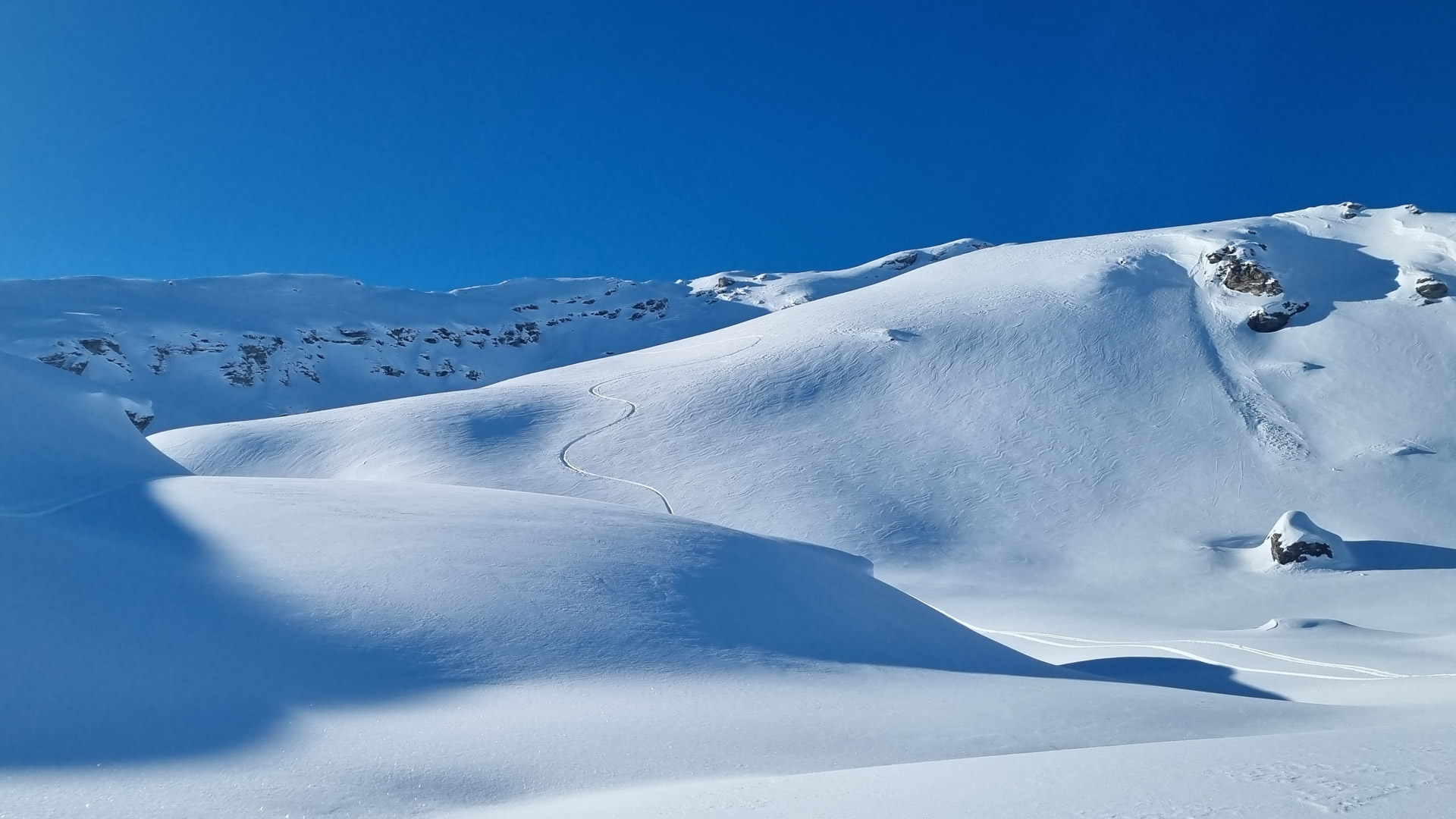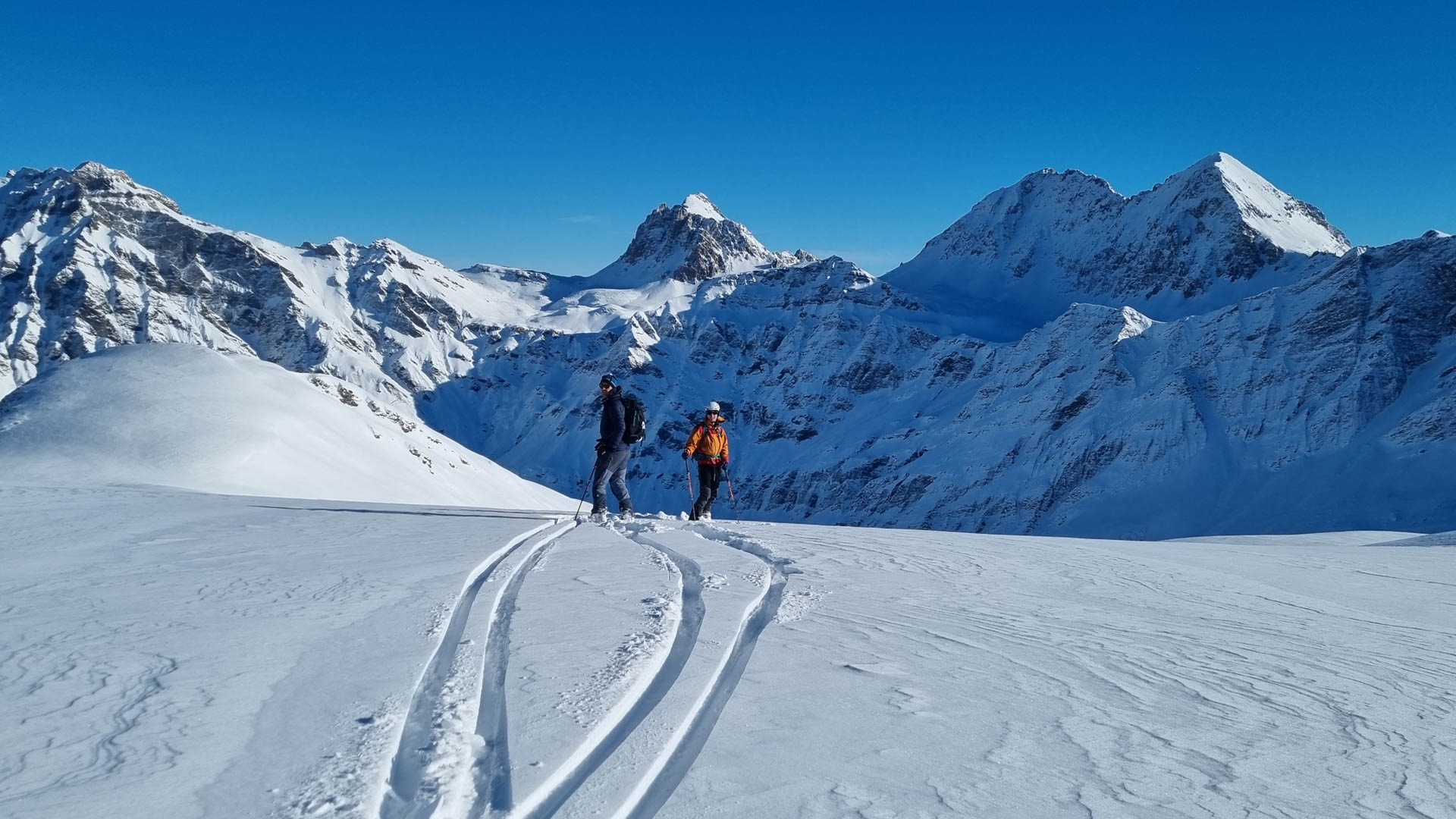 Die Abfahrt beginnt im oberen Teil entlang der Aufstiegsroute, ehe sich die weiten Hänge öffnen und zahlreiche Varianten zur Wahl stehen. Nur die Waldzonen bleiben wir bewusst aus, um den Lebensraum der Wildtiere zu schonen. Mit etwas Glück taucht die tief stehende Sonne die gegenüberliegenden Felswände in goldenes Licht und begleitet uns bis zum letzten Schwung kurz vor dem Hotel. Dort angekommen, lassen wir den ersten Tag bei einem Apéro und einem herzhaften z`Nacht in gemütlicher Runde mit unseren Gastgebern ausklingen.
