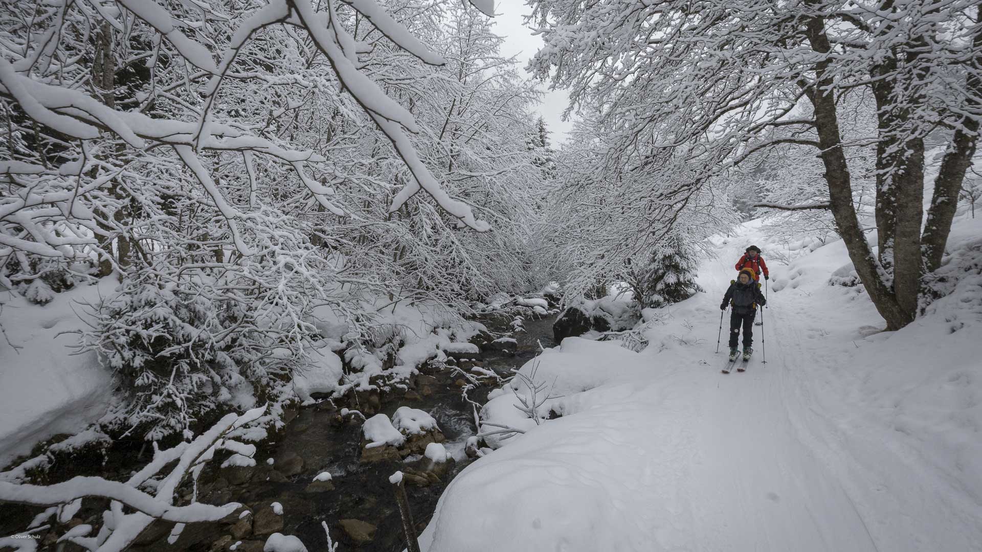 Was gibt es Schöneres, als eine Skitourenwoche gleich mit einem Gipfel namens Schönjöchlspitze zu beginnen? Moderate 800 Höhenmeter und der Start auf einem gemäßigten Forstweg lassen uns mit dem Sarntal in aller Ruhe warm werden. Zuvor haben wir uns kurz in der Unterkunft getroffen und unsere Hotelsachen verstaut. Mit etwas Glück erwischen wir rechtzeitig den Bus, der uns noch ein paar Minuten weiter hinein ins Sarntal bringt. Direkt in Pens steigen wir auf unsere erste Tour ein. Anfangs folgen wir einem breiten Fahrweg, der später auch eine problemlose Abfahrt zulässt. Schnell verengt sich das Tal, und der Kirchbergbach begleitet unseren Aufstieg. Wir gewinnen rasch an Höhe. Sobald wir die Weideflächen der Kirchbergalm erreichen, überblicken wir das weitläufige Tourengebiet. Schon hier sind einige Aufstiegs- und Abfahrtsvarianten auf die Schönjöchlspitze möglich. Auf der nach Nordosten ausgerichteten Tour gibt es meist lange im Jahr guten Schnee, und Touren dieser Art bietet das Sarntal noch etliche. Also: hinein ins Abfahrtsvergnügen und zurück nach Pens!