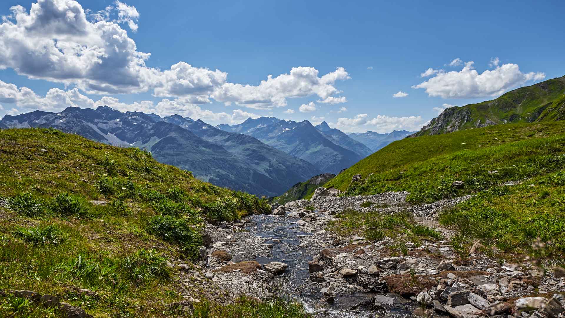 Zeitig starten wir in unser Bergabenteuer. Der Weg führt uns durch das idyllische Almjurtal, dem gleichnamigen Bach entlang, stetig bergauf Richtung Talende. Die Landschaft wird zunehmend alpiner, bis wir auf 2.430 Metern das Erlijoch erreichen. Von dort ist es nicht mehr weit bis zu unserem ersten Etappenziel: der Stuttgarter Hütte auf 2.305 Metern Höhe – ein perfekter Ort für eine wohlverdiente Rast mit Panoramablick.
