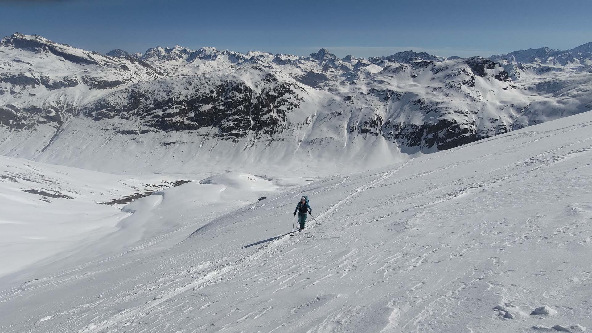 Der Tag beginnt in Juppa (2.126 m), wo der Winterwanderweg sanft ansteigend in das weit verzweigte Bergalgatal führt. Die Spur zieht nach Süden, begleitet vom gleichmäßigen Rauschen des Bergalga-Bachs, der hier oberhalb der Waldgrenze durch eine breite Mulde verläuft. Der Anstieg bleibt im ersten Abschnitt moderat, bevor das Gelände sich in Richtung Bergalgapass (2.869 m) spürbar öffnet. Die Hänge sind weit und übersichtlich, ideal für eine sichere Linienwahl im winterlichen Gelände. Mit zunehmender Höhe zeigt sich die stille Hochgebirgslandschaft: Die Hänge unterhalb des Piz d’Err (3.378 m) dominieren das Tal, während die Spuren im glitzernden Schnee langsam an Höhe gewinnen. Nach einer ausgedehnten Rast im oberen Talbereich beginnt der Rückweg entlang der Aufstiegsroute. Die Nordhänge oberhalb von Juf (2.126 m), der höchstgelegenen ganzjährig bewohnten Siedlung Europas, fangen am Nachmittag das warme Licht ein – ein stiller Abschluss dieses ausgedehnten Wintertages.